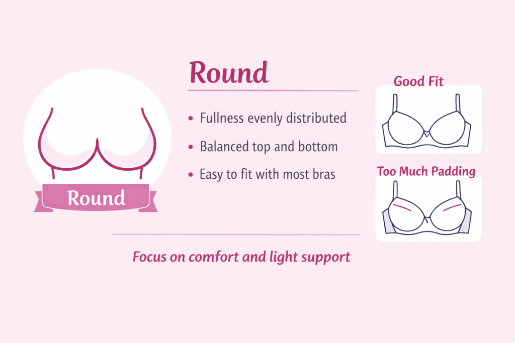 Round breasts have equal fullness on both the top and bottom. This balanced distribution makes them one of the easiest shapes to fit.
